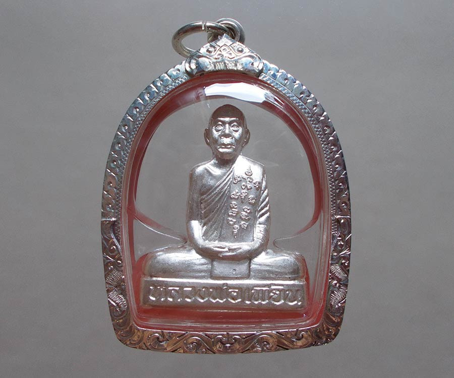 รูปเหมือนปั้ม รุ่นเพชรกลับ หลวงพ่อเพี้ยน วัดเกริ่นกฐิน จ.ลพบุรี ไตรมาส พ.ศ.2555 เนื้อเงิน ตอกโค๊ต ตอกเลข เลี่ยมกรอบเงินยกซุ้มสวยมาก !! |