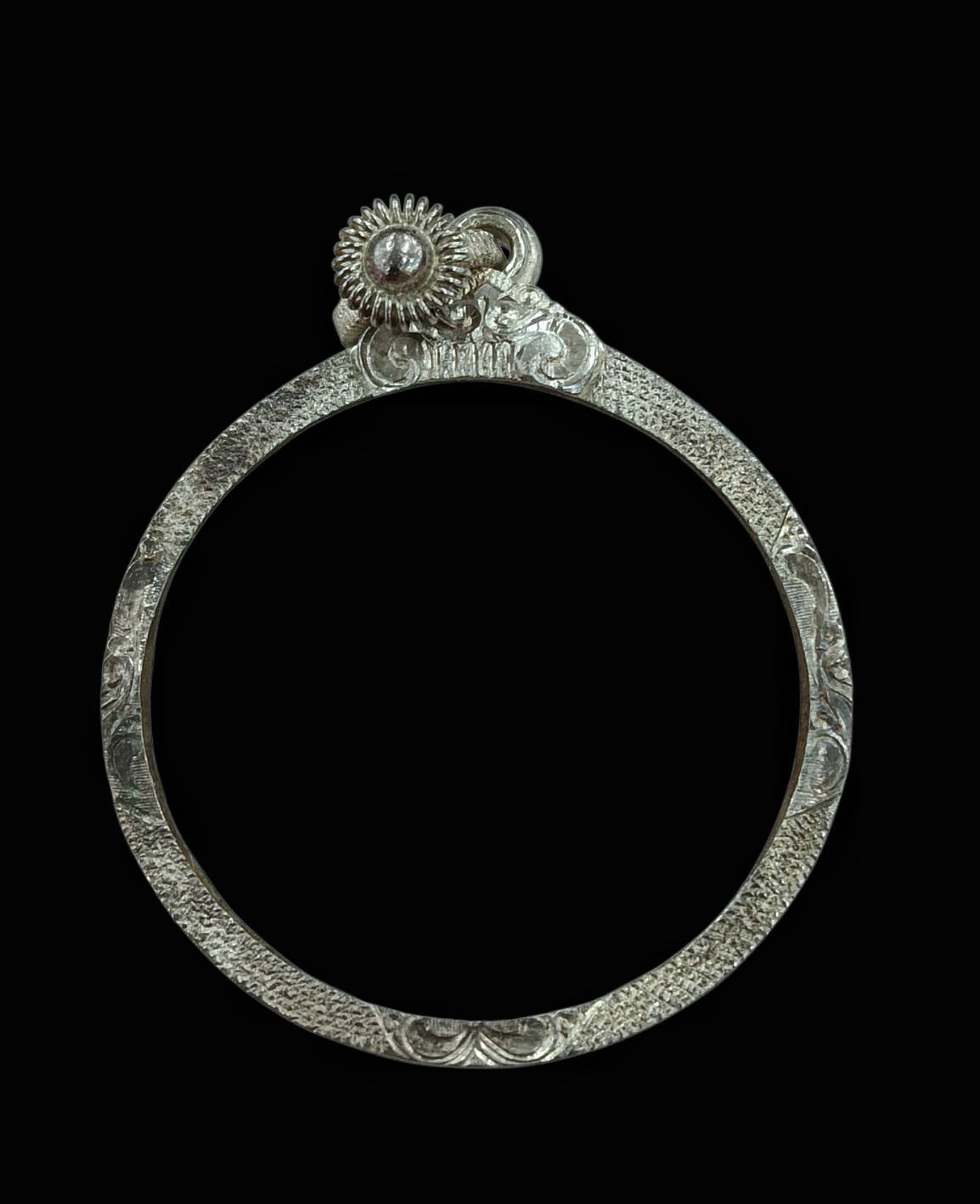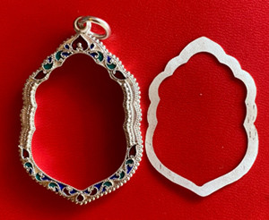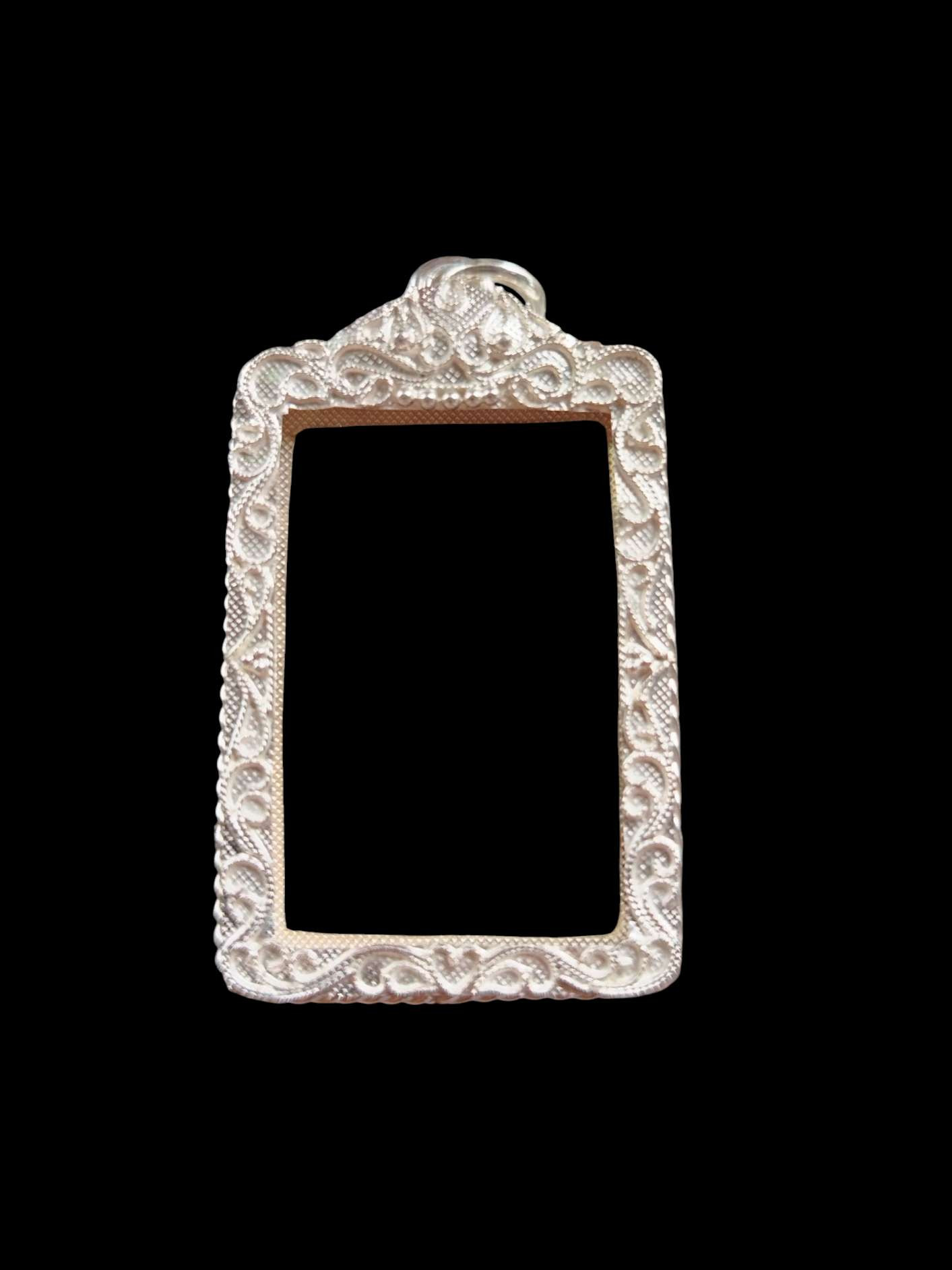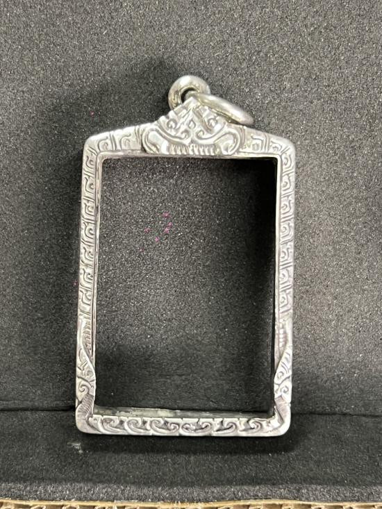 กรอบเงินแท้ทรงกลม ขนาดกว้าง 3.5 สูงวงใน 3.8 สูงรวมห่วง 4.0 ซม.ออกแบบแกะลายสวยงาม สภาพสวยไม่ฉีกไม่ขาดครับ |