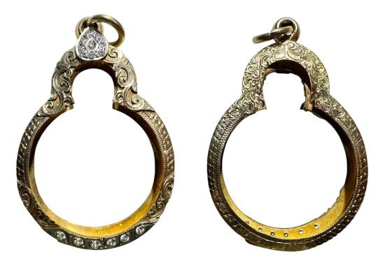 (เคาะเดียวแดง) กรอบทองคำแท้ ทรงกลม (ลงยา ห่วงเชื่อม) น้ำหนัก 6.1 กรัม เปอร์เซ็นสูง 81.18 |
