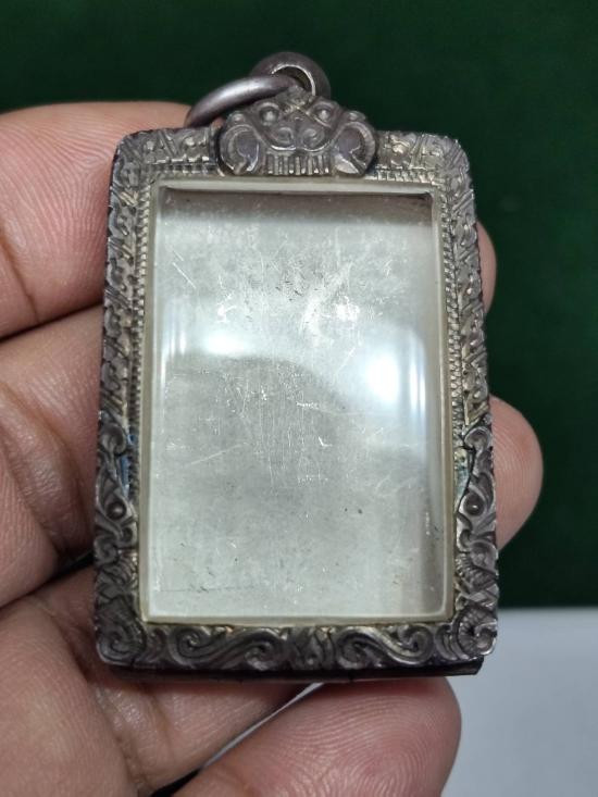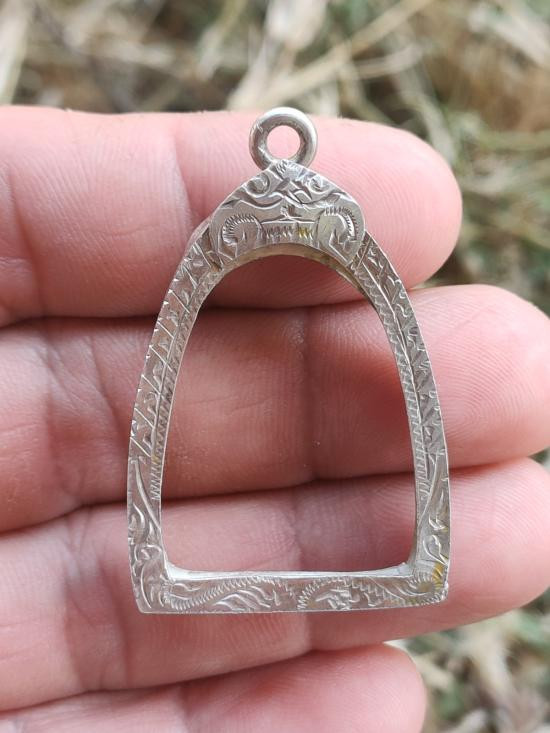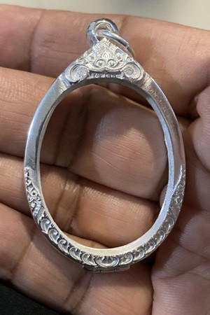 <<กรอบเงินแท้95%>>มือหนึ่ง ยกซุ้มหัวสิงห์ย้อย ใส่เหรียญหลวงพ่อกวย หลังหนุมาน-หลังยันต์ งานมือช่างทองแกะลายลึกๆสวยๆ หนัก5.61g |