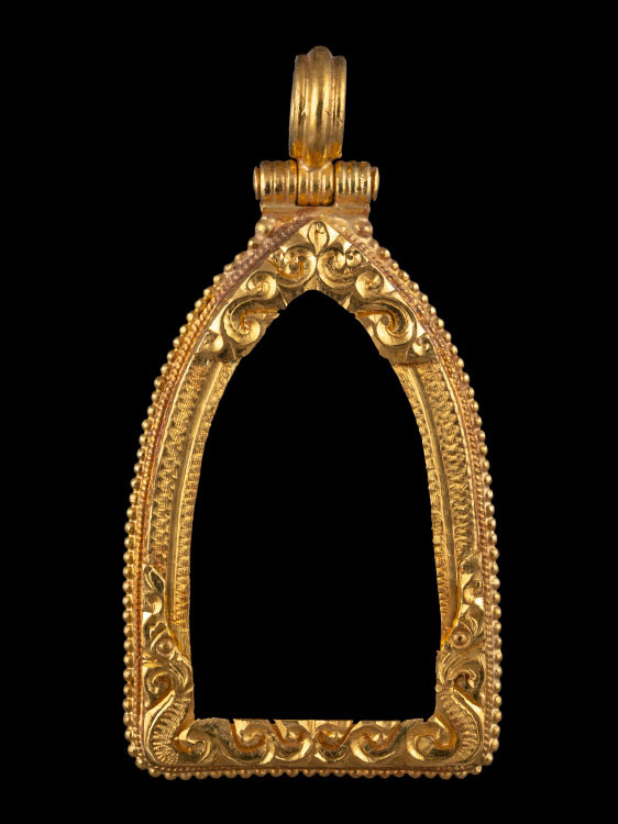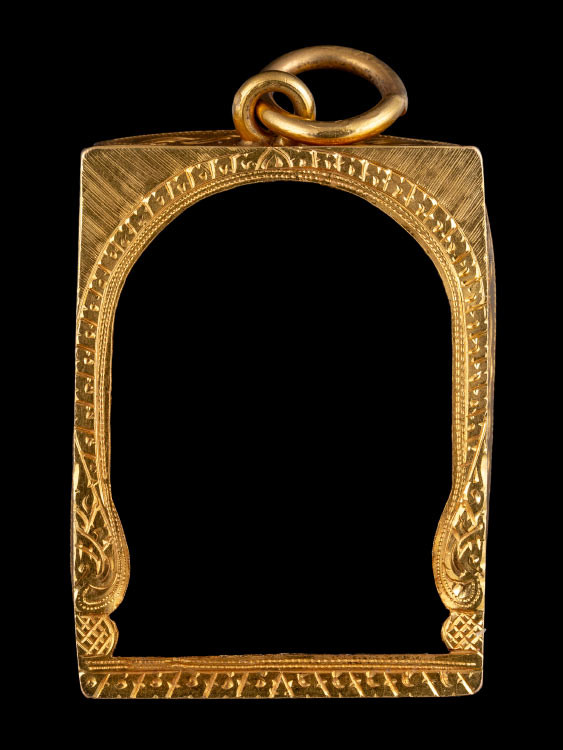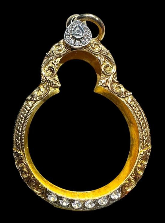 กรอบทองคำแท้ ใส่เหรียญเสมา มือสอง น้ำหนัก 2.2กรัม ยกซุ้มสวยงาม เดิมใส่เหรียญเสมา ลป.ทวด รุ่น3-เกจิคณาจารย์ทั่วไป + บัตรรับรอง G-PRA |