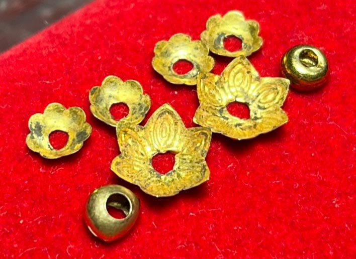 เม็ดทองคำ 2 เม็ด + ฝาครอบทองคำ 6 อัน ขนาดตามรูป พร้อมใบเปอร์เซ็นต์ทอง |