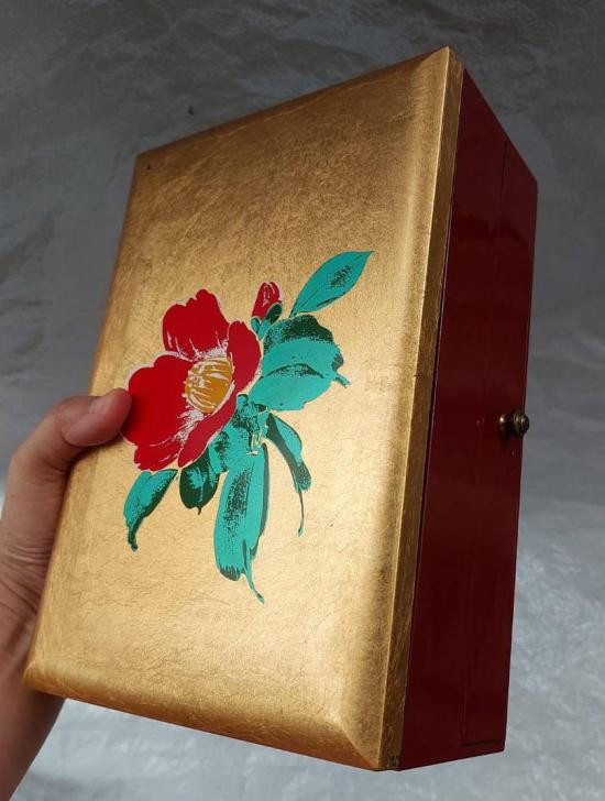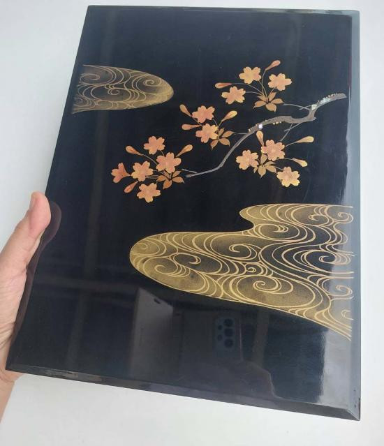 ***วัดใจ***กล่องไม้วินเทจญี่ปุ่น งานไม้ญี่ปุ่นเคลือบเงาแบบ Wajima-nuri พื้นดำลวดลายทองสวยงาม ทรงสี่เหลี่ยมผืนผ้า ขนาด A4 หนา 1.5 นิ้ว