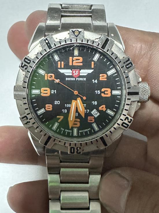 นาฬิกา Swiss Force สายและตัวเรือนเป็นสแตนเลส เดินปกติ เบเซลล์หมุนได้ตามปกติ (เม็ดมะยมติดดึงไม่ออก คาดว่าลูกยางน่าจะบวม) |
