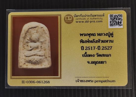 พระพุทธหลวงปู่ดู่ วัดสะแก จ.อยุธยา พิมพ์หลังหัวแหวน เนื้อผง ปี2517-2527+บัตร |