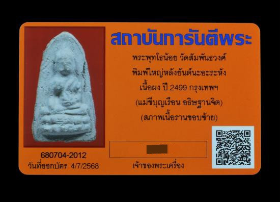 พระพุทโธน้อย แม่ชีบุญเรือน พิมพ์ใหญ่ ปี 2499 เนื้อผง หลังยันต์นะอะระหัง พร้อมบัตรรับรอง |