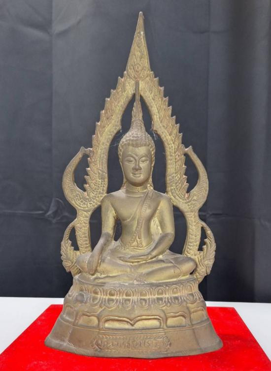 พระบูชาจีวรดอกพิมพ์มารวิชัย เนื้ออลูมิเนียมขาปิ่นโต ขนาดหน้าตัก 5 นิ้ว ฐานอุดปูนผสมผง |