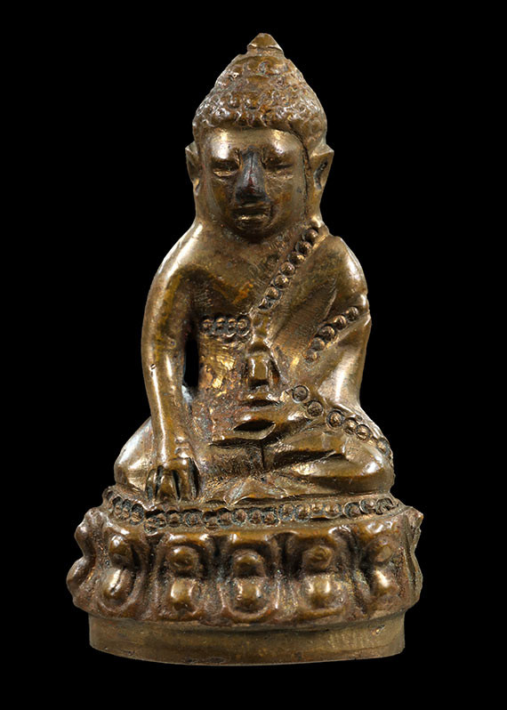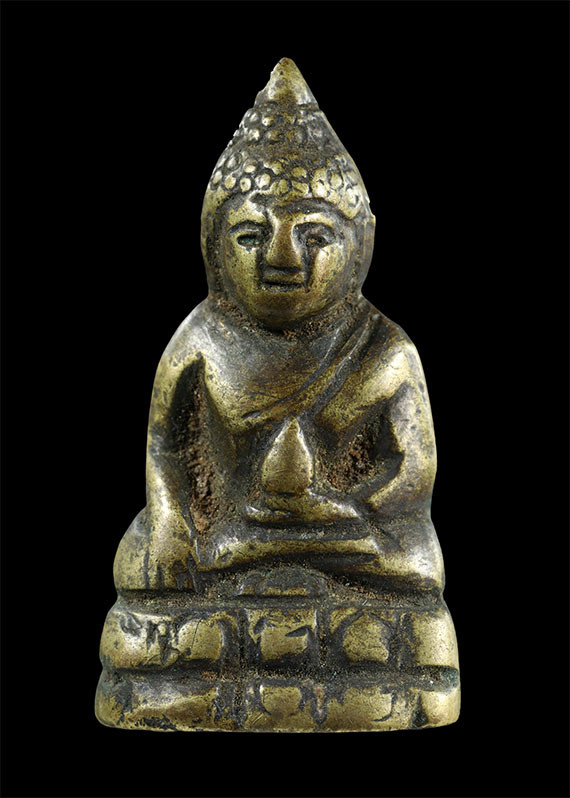 พระกริ่งก้นถ้วย เนื้อออกสำริด เก่าไม่ทราบที่ เขย่าไม่มีเสียง |
