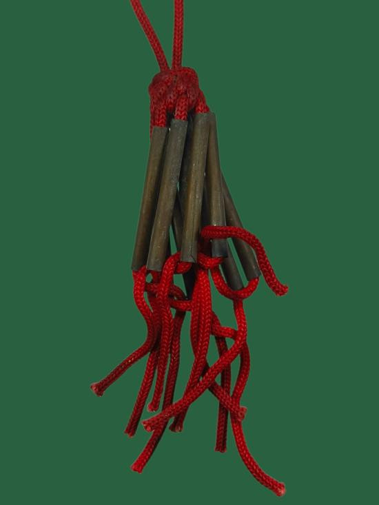 ตะกรุดกลุ่ม 9 ดอก เนื้อทองแดง ยาวประมาณ 3 ซม.สำหรับห้อยหน้ารถ ไม่รู้ที่วัดใจ 100 แดงครับ |
