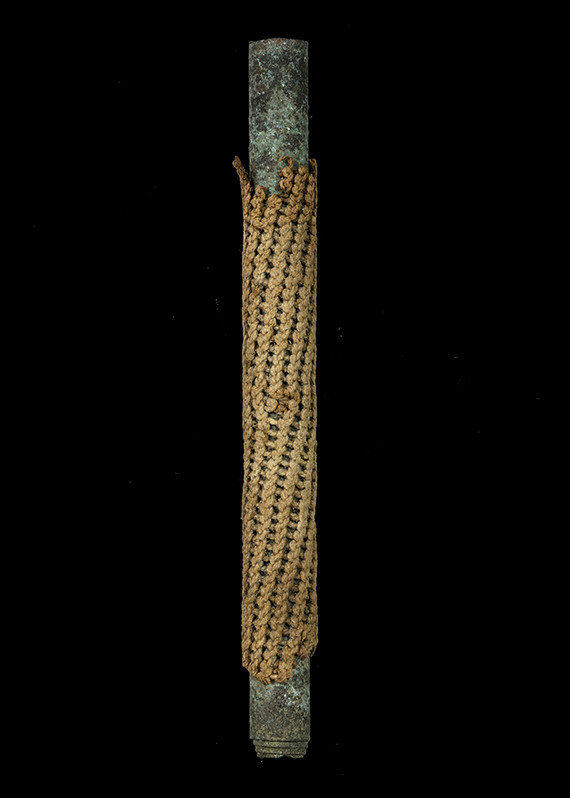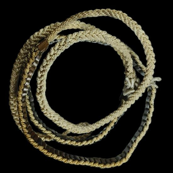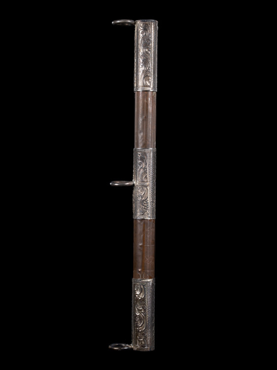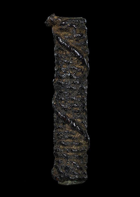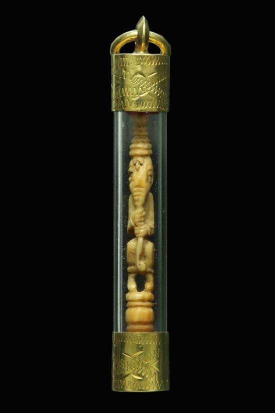 ตะกรุดสาริกา หนังหน้าผากเสือถักเชือกลงรักเก่า อายุร้อยปี ไม่ทราบที่ ขนาดความยาว 2 นิ้ว |