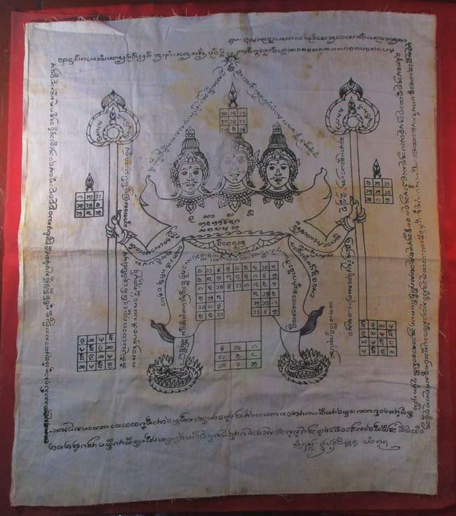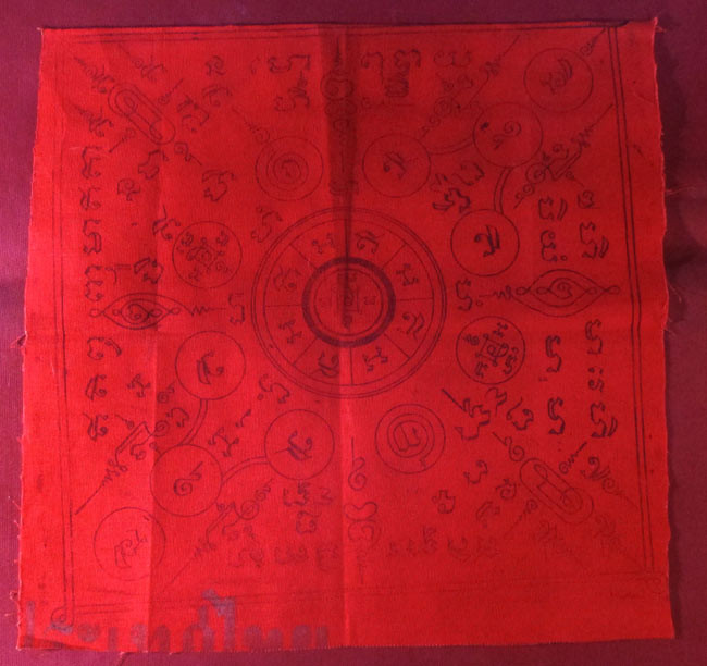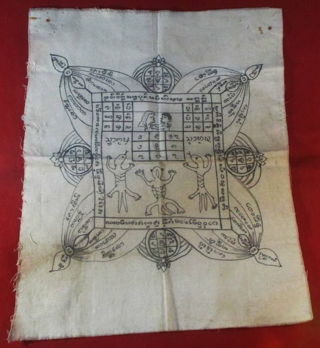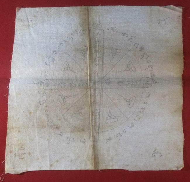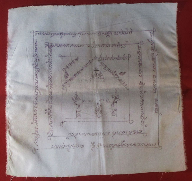 ผ้ายันต์ ไม่ทราบที่ จารยันต์ด้วยมือ จารด้วยดินสอ เนื้อผ้าดูเก่า ครับ (พระบ้าน ครับ) |