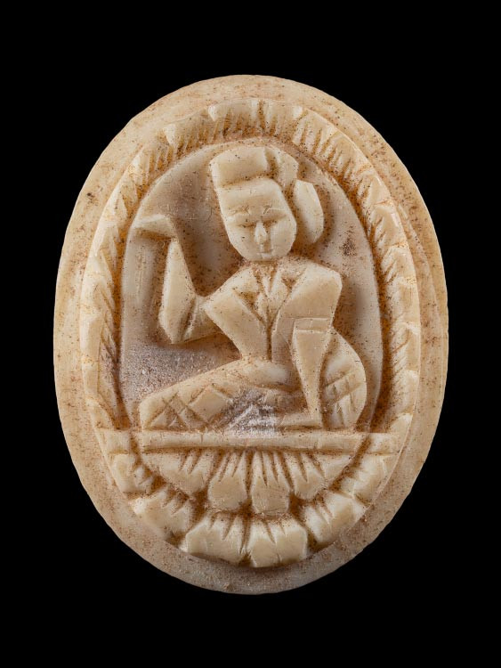 วัดใจ พระสมเด็จ เนื้องาแกะ ขนาดกว้าง 1.8 ซม. สูง 2.8 ซม. เลี่ยมพลาสติกเก่าๆ |