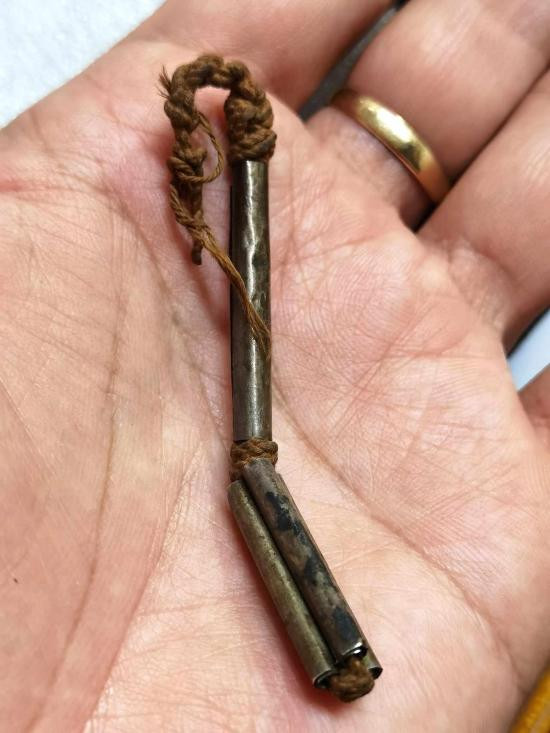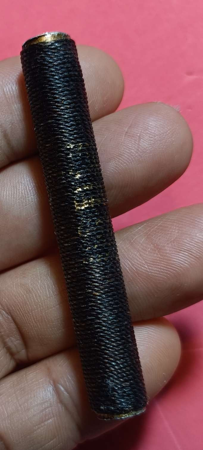 วัดใจแผ่นตะกั่วเก่าม้วนเป็นตะกรุดโทน หุ้มปลอก ยาว 2.7 นิ้วไม่ทราบวัดที่สร้างครับ |