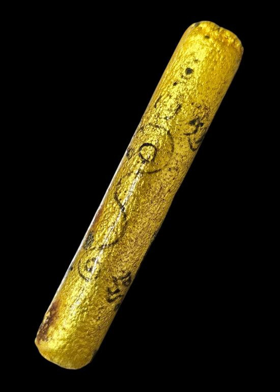 ( 1 ) ตะกรุดถักเชือก ลงรัก ปิดทอง ร้อยเชือกเจ็ดสี ทำบุญมาจำชื่อวัดที่สร้างไม่ได้ สภาพพระตามรูปที่ลงทุกประการ (ขนาดยาวประมาณ 5 นิ้ว) |