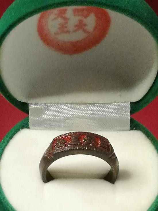 แหวนลงยา อักษรจีน พร้อมกล่องกำมะหนี่ ขนาดไซร์ประมาณ 59-60 ไม่ทราบที่ |