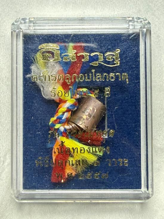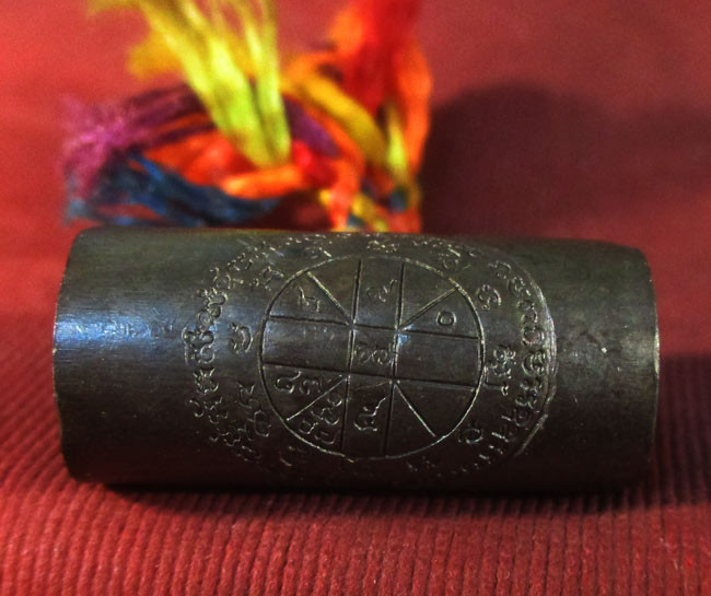 ตะกรุดลูกอมโลกธาตุ เนื้อทองแดงร้อยไหม5สี เนื้อโลพหะ ไม่ทราบที่ พร้อมกล่องครับ |