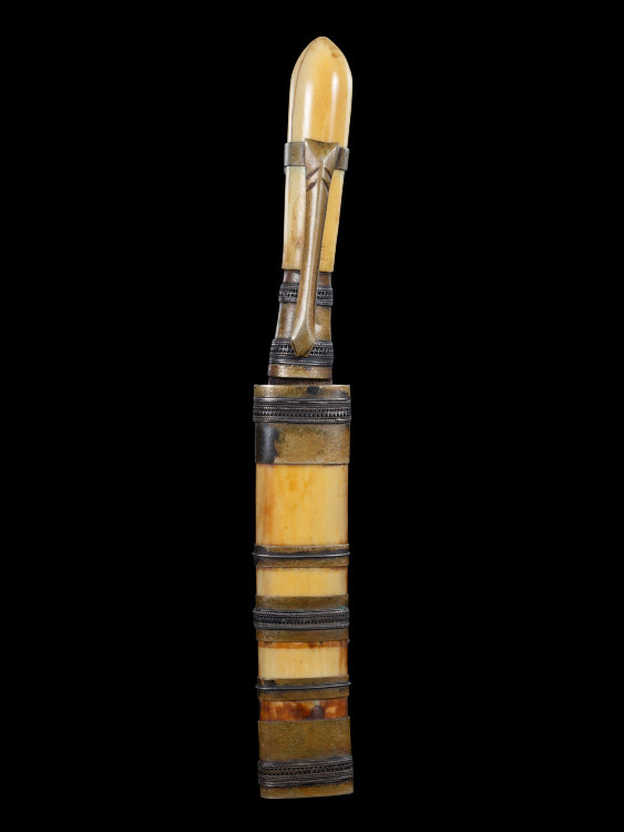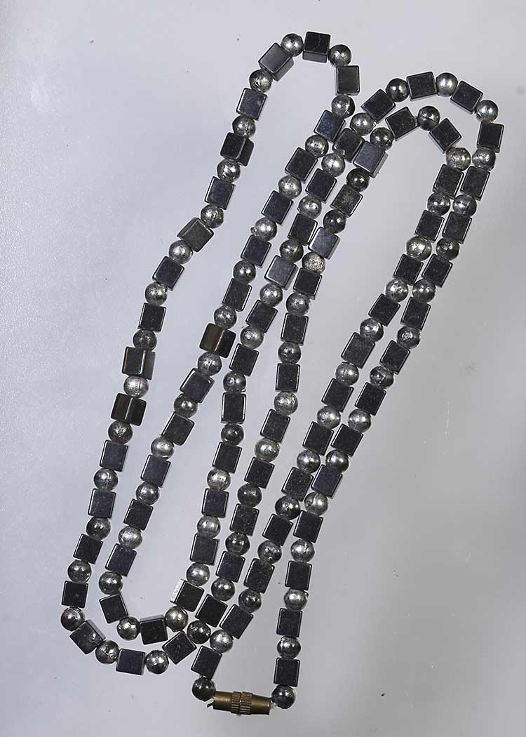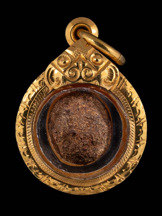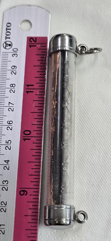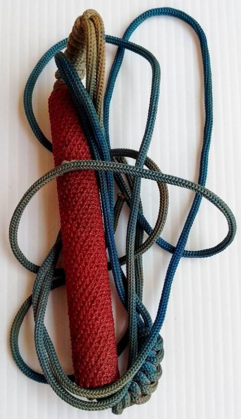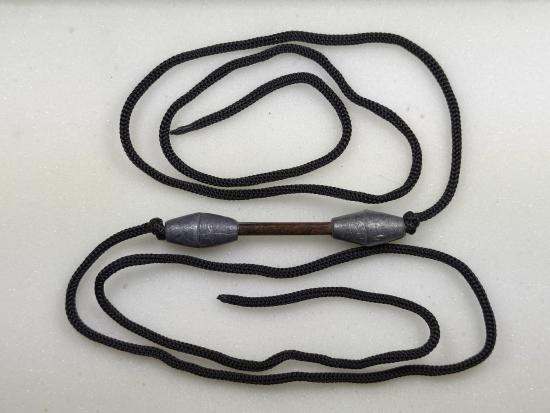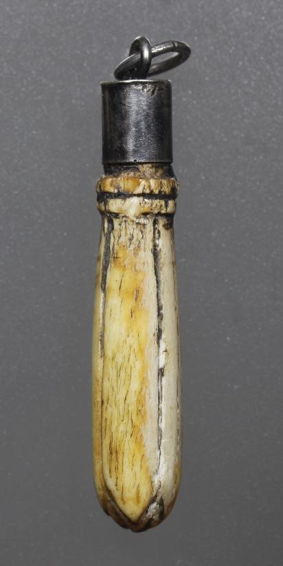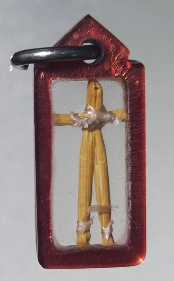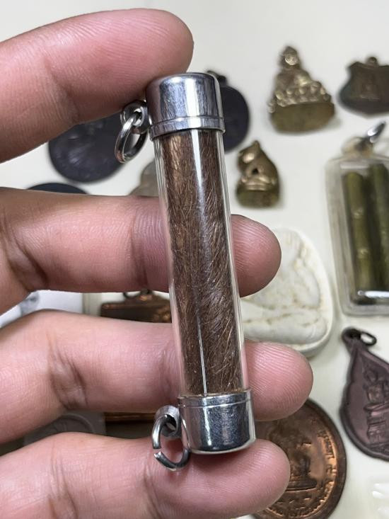 ตระกรุดถักเชือก ยาวประมาณ 2 นิ้ว เลี่ยมเงินอย่างดี ไม่ทราบที่คับ |