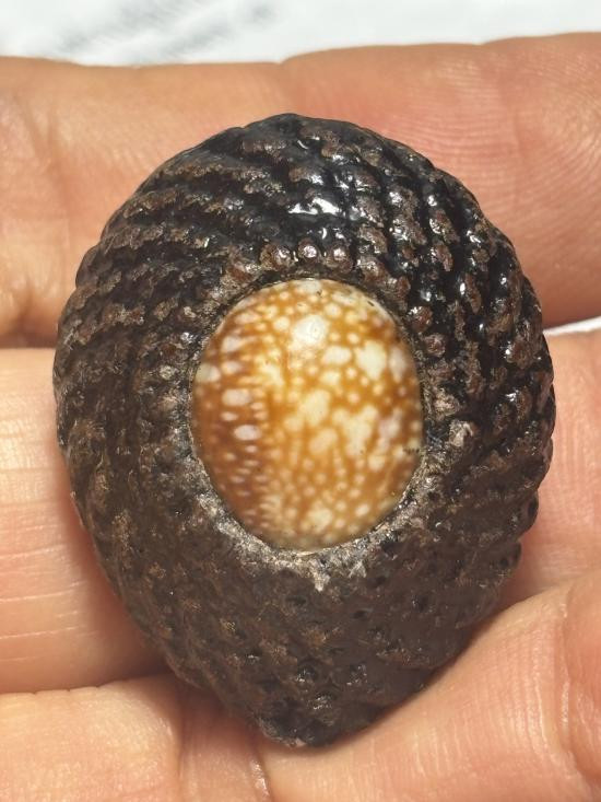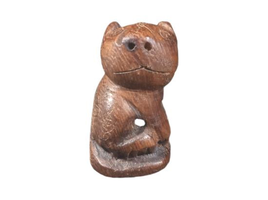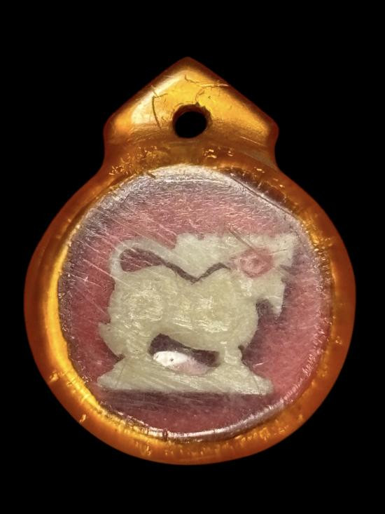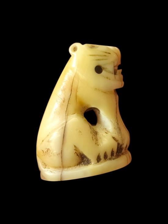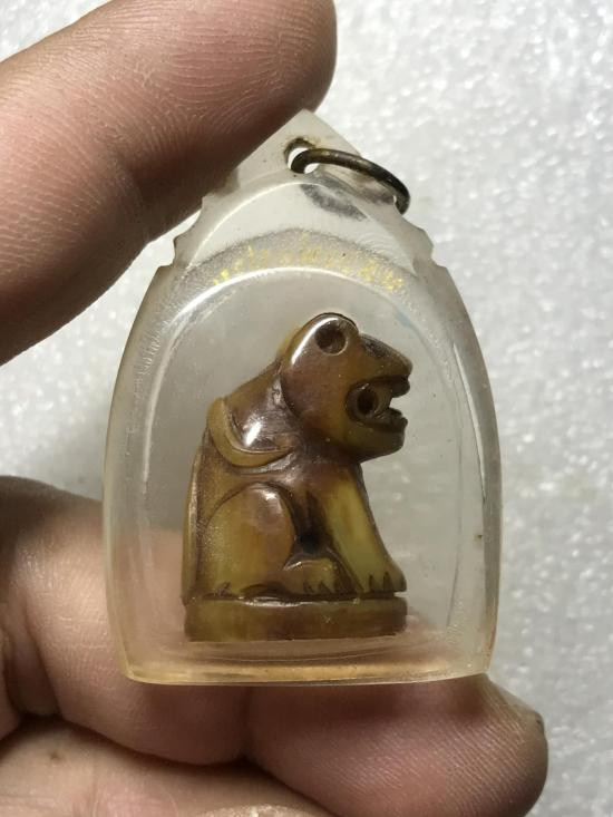 สิงห์งาแกะ ปากเจาะหัวมังกร งานสิ่วแกะมือ ขนาด 2 ซม. อยู่ในตลับสีผึ้ง สวยสมบูรณ์ ไม่ทราบที่ครับ |