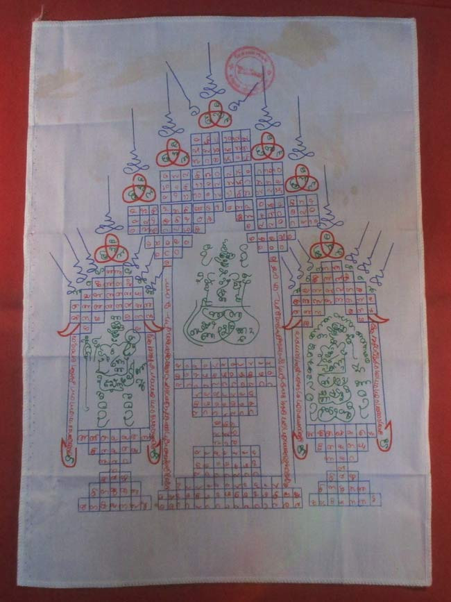 ผ้ายันต์ ไม่ทราบที่ ลวดลายสวย มีตราวัดแต่ผมอ่านไม่ออก ครับ (พระบ้าน ครับ) |