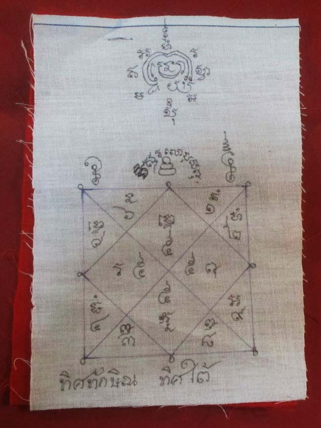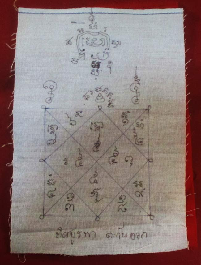 ผ้ายันต์ ไม่ทราบที่ จารยันต์ด้วยมือ ที่ผ้ายันต์เขียน "ทิศบูรพา ตะวันออก" ครับ (พระบ้าน ครับ) |