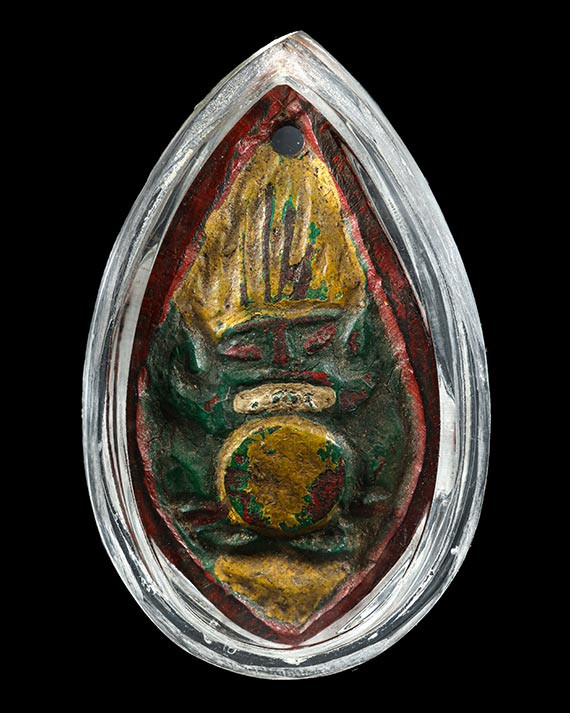 แดงที่ 150 สิงห์งาแกะเก่า ขนาด 2 ซม. ไม่ทราบสำนัก เหมาพระชาวบ้านแล้วติดมาด้วยค่ะ ศิลปะสวยงามมีเอกลักษณ์ น่าสะสมค่ะ |