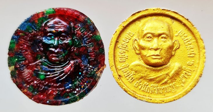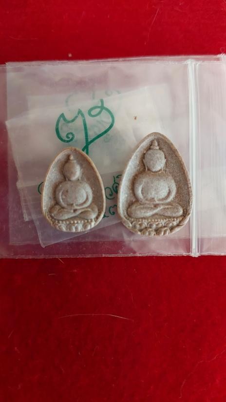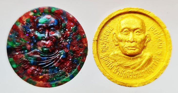 << วัดใจ >> ชุดที่ 1 พระผงจันทร์ลอย พระยุคต้น หลวงปู่ละมัย (ลมัย) ฐิตมโน ปี2543 จำนวน 2 องค์ (เนื้อเรซิ่นผสมพลอยเสก+ทาทอง) สภาพสวย |