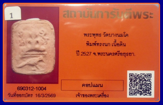 สวยๆ บัตรการันตี ทรงนก ผงเต็ม -600-พระหลวงพ่อปาน วัดบางนมโค อยุธยา พ.ศ 2527 |