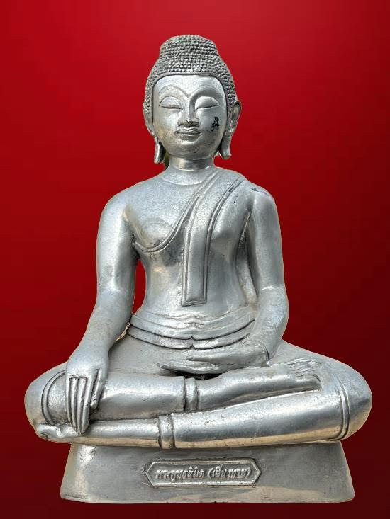 พระบูชา พระพุทธนิมิตร หรือ พระเสี่ยงทาย วัดเสาธง หน้าตัก 9 นิ้ว สูง 13 นิ้ว เนื้อเงินยวง |
