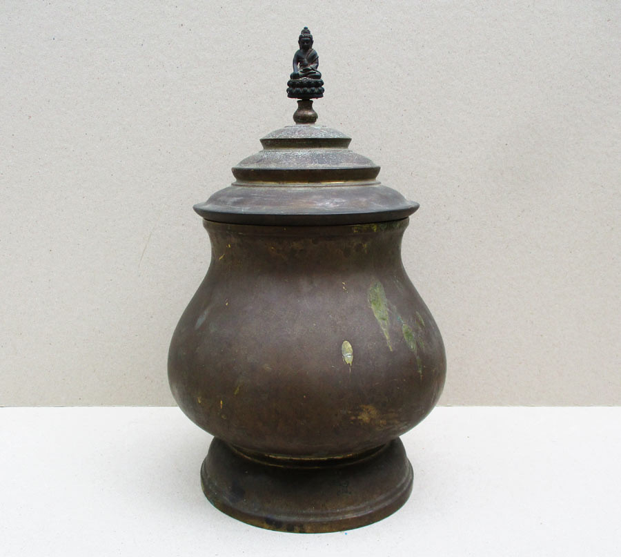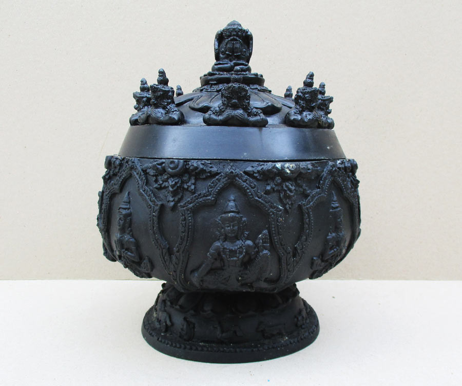 ครอบน้ำมนต์จตุคามรามเทพ รุ่น หลักเมืองพุทธาคมเขาอ้อ พ.ศ.2549 เนื้อทองเหลืองรมดำ มีฝาครอบ ปากกว้าง 7 นิ้ว สภาพสวยกริ๊บๆ !! |