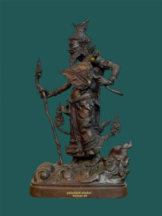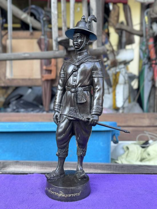 สมเด็จพระนเรศวรมหาราช ทรงประกาศอิสสระภาพ 400 ปี ( ยืนหลั่งน้ำสิโนทก ) ณ.วัดพรหมสุวรรณสามัคคี พ.ศ.2527 สูงรวมฐาน 12 นิ้ว เนื้อโลหะรมมันปู ผิวหิ้ง 2 ถอด !! |