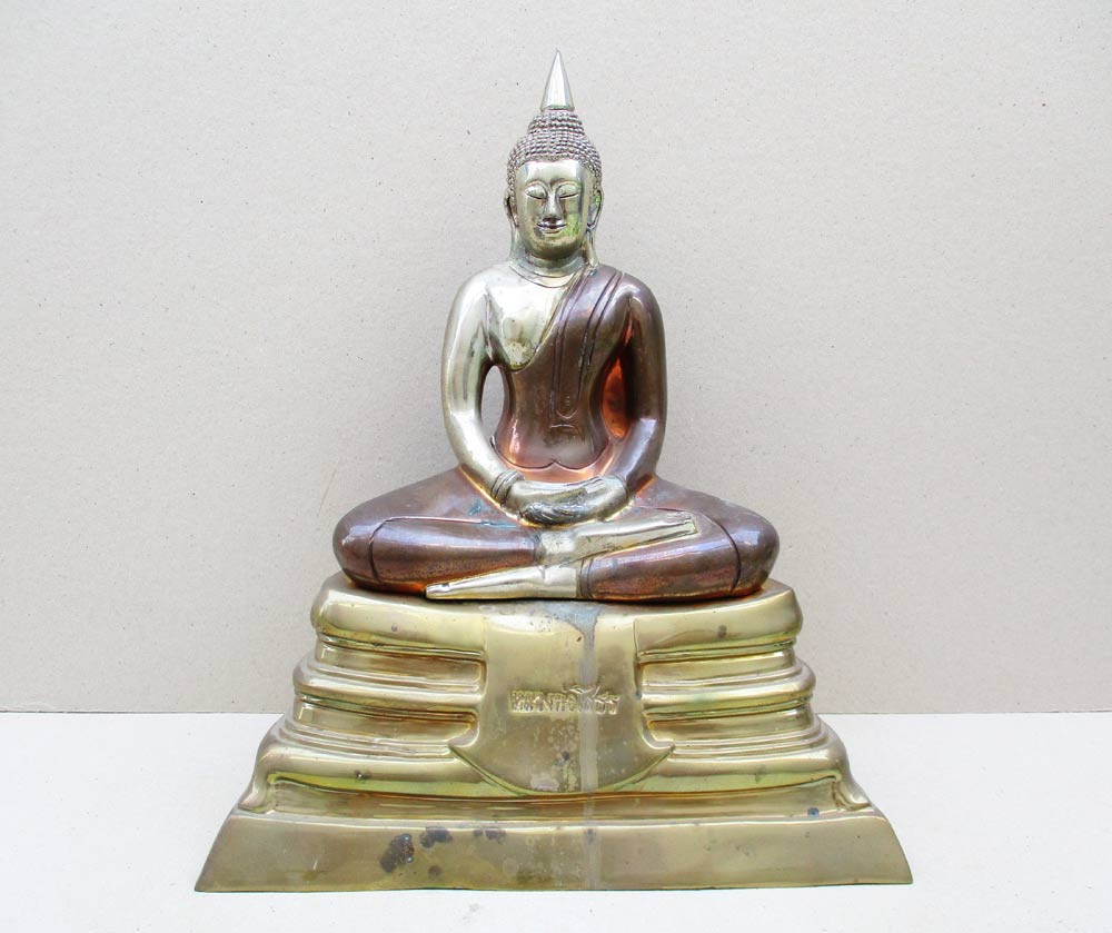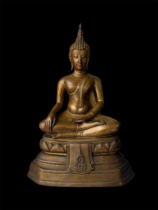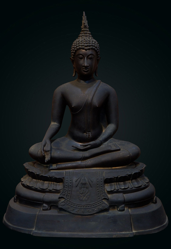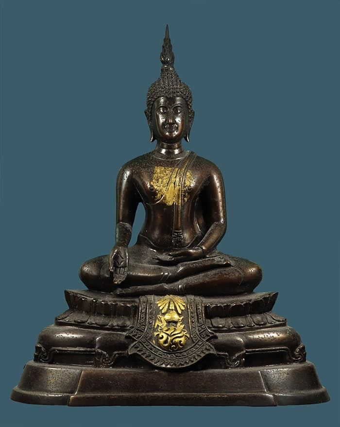 พระพุทธรูป ทรงเครื่องจักรพรรดิ์ เนื้อโลหะรมมันปู ปางสมาธิ |