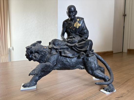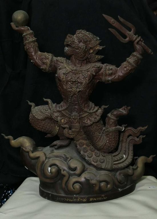 สมเด็จพระนเรศวรมหาราช ทรงประกาศอิสสระภาพ 400 ปี ( ยืนหลั่งน้ำสิโนทก ) ณ.วัดพรหมสุวรรณสามัคคี พ.ศ.2527 สูงรวมฐาน 12 นิ้ว เนื้อโลหะรมมันปู ผิวหิ้ง 2 ถอด !! |