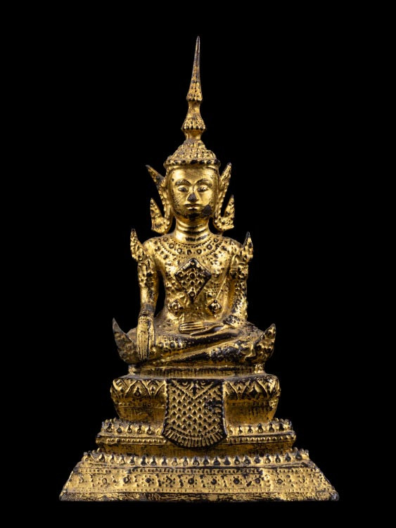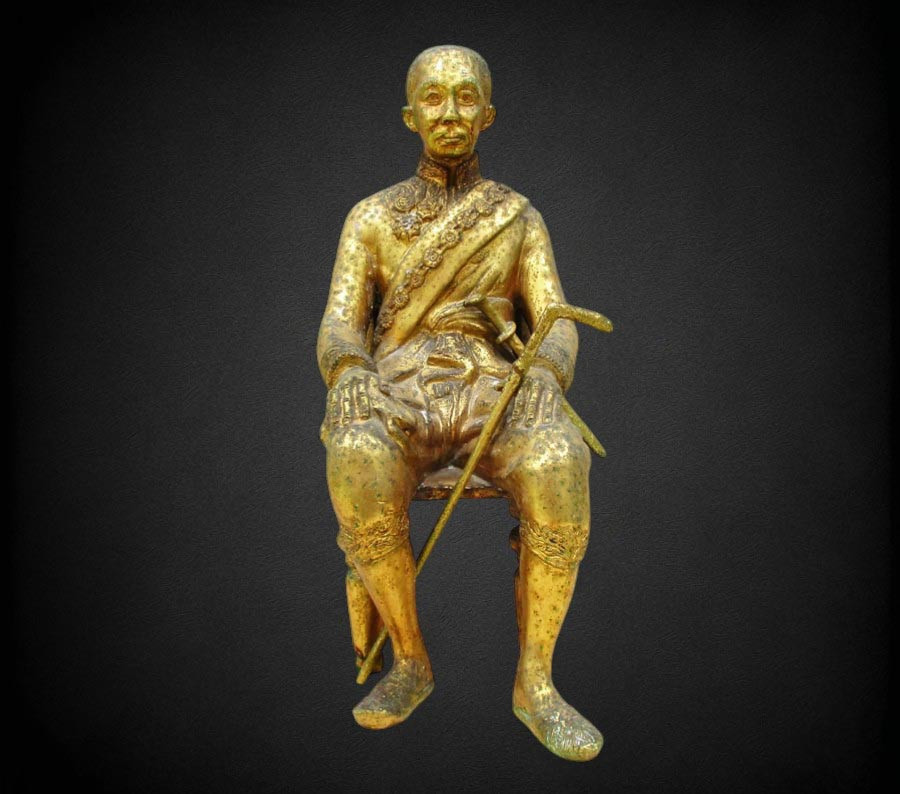 พระบรมรูปบูชา พระบาทสมเด็จพระจอมเกล้าเจ้าอยู่หัว รัชกาลที่ 4 วัดศีลขันธาราม จ.อ่างทอง พ.ศ.2521 เนื้อโลหะกะหลั่ยทอง ผิวแห้งหิ้ง 3 ถอด !! |
