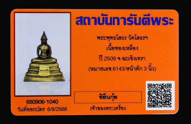 พระบูชาหลวงพ่อโสธร หน้าตัก 3 นิ้ว ปี2509 (ตรงปี) หมายเลข 6143 พร้อมบัตรรับรอง G-Pra |