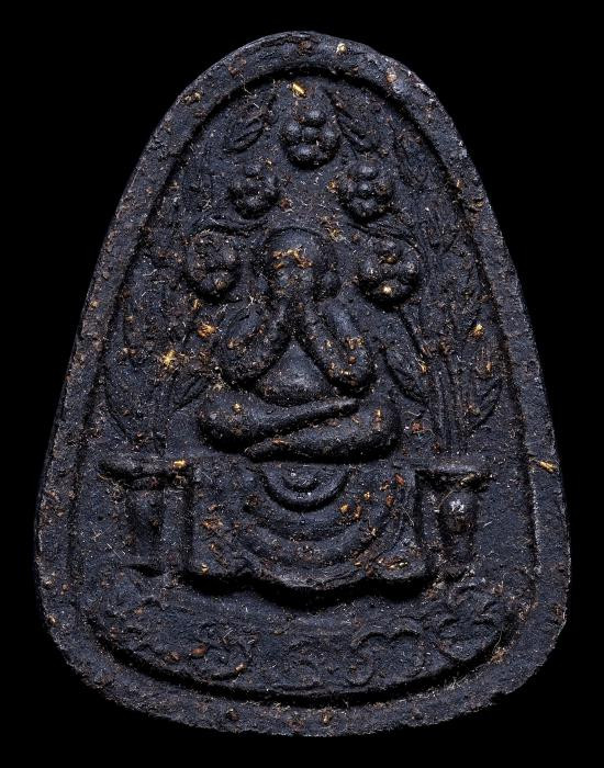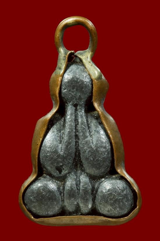 พระปิดตาซุ้มแจกัน หลวงปู่เฮี้ยง วัดป่า จ.ชลบุรี ปี 2510 พิมพ์นิยมหลัง พ.ศ. เนื้อผงคลุกรัก โรยผงตะไบทอง บรรจุกริ่ง แดงเคาะแรก |