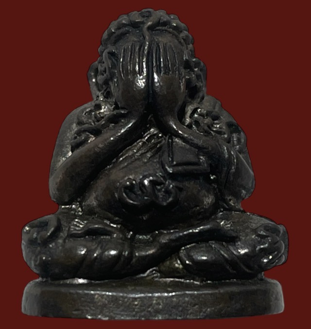 พระปิดตาซุ้มแจกัน หลวงปู่เฮี้ยง วัดป่า จ.ชลบุรี ปี 2510 พิมพ์นิยมหลัง พ.ศ. เนื้อผงคลุกรัก โรยผงตะไบทอง บรรจุกริ่ง แดงเคาะแรก |