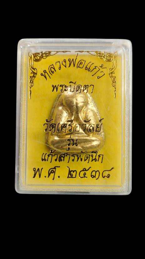 **100.** พระปิดตาหลวงพ่อแก้ว วัดเครือวัลย์ รุ่นแก้วสารพัดนึก ปี2538 ผสมมวสสารเก่าหลวงปู่แก้ว กล่องเดิมครับ |