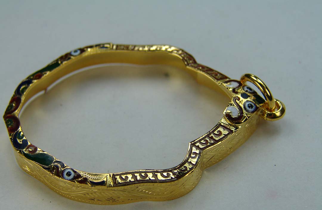 กรอบทอง ลงยาเต็ม ยกซุ้ม หัวสิงห์ ข้างแกะลาย ใส่เหรียญ **มังกรคู่** หลวงปู่หมุน หรือ ขนาดไกล้เคียง งานขึ้นมือ น้ำหนัก 4.38 กรัม ( ขนาดความสูง 4 ซม. กว้าง 2.6 ซม. วัดจากขอบใน ) เปอร์เซ็นต์ทอง 65-70 เปอร |