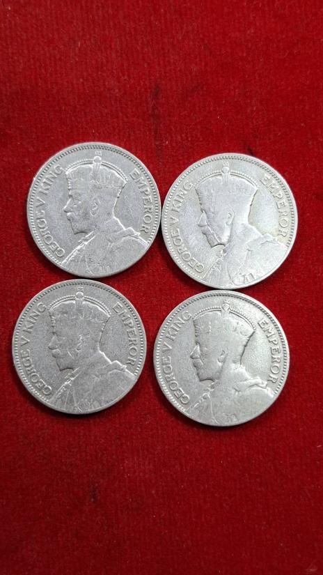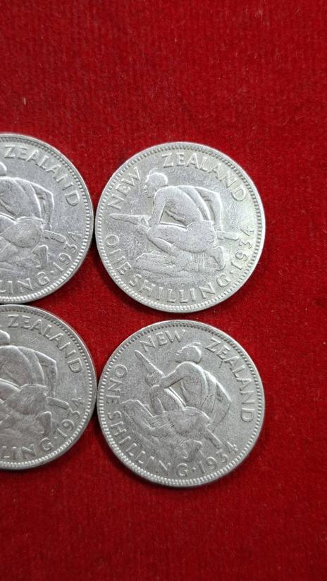 เหรียญ 1 ชิลลิงของนิวซีแลนด์ที่ผลิตในปี ค.ศ. 1934 ด้านหน้า: เป็นพระบรมสาทิสลักษณ์ของพระเจ้าจอร์จที่ 5 แห่งสหราชอาณาจักร เนื้อเงิน 56% ทั้งหมด 4เหรียญ |