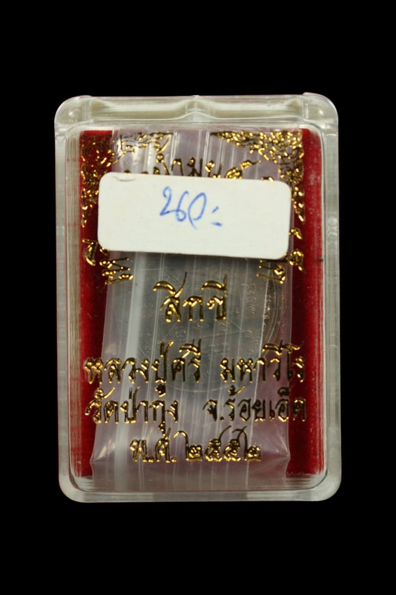 เหรียญทำน้ำมนต์ หลวงปู่ศรี มหาวีโร รุ่น๓ ปี๒๕๕๒ พิมพ์รูปไข่เล็ก ขนาดเหรียญสูง 2 ซม. กว้าง 1.7 ซม.พิมพ์กรรมการพระสิกขี ถวายหลวงปู่ศรีอธิฐานจิตเมื่อ ๑๔ พฤศจิกายน จำนวนการสร้าง เนื้อทองคำ ๒๖ เหรียญ ,เงิน ๑๔๔ เหรียญ ,นวะโลหะ ๓๕๓ เหรียญ ,เนื้อสตางค์ ๕,๑๕๑ เหรียญ ตอกโค๊ตทุกเหรียญ |