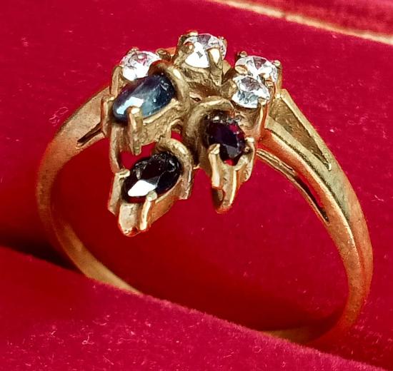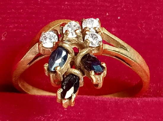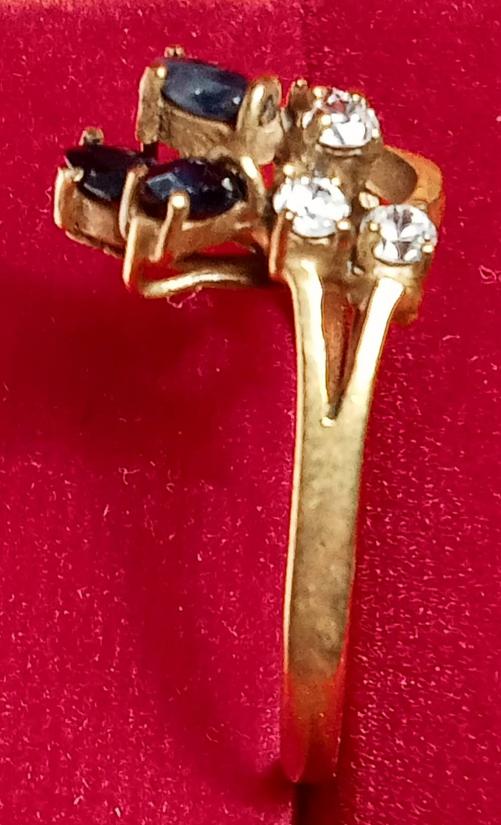แหวนทองเหลืองขัดเงา หัวแหวนเป็นหนามเตยเกาะพลอยไพลินสีน้ำเงินเข้มเกือบดำ นิล และเพชรประดิษฐ์ ทรงดอกไม้แฉก ไซซ์ประมาณ 55 วงนี้อายุหลายสิบปี สภาพตามรูป ราคาเบา ๆ ครับ แถมแหวนงานจิวเวอร์รี่ ไซซ์ประมาณ 54 ให้อีก 1 วง สุดคุ้ม ส่งฟรีทั่วไทย รับประกันตามกฎครับ |