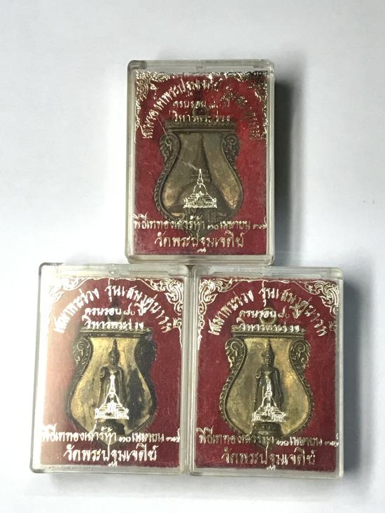 เหรียญเสมาหล่อ องค์พระปฐมเจดีย์ รุ่นเสมาคู่บารมี ครบรอบ ๘๐ วิหารพระร่วง ปี 2537 เนื้อทองระฆัง ตอกโค๊ต สภาพสวยมาก มีกล่องเดิมๆ 3 องค์ |