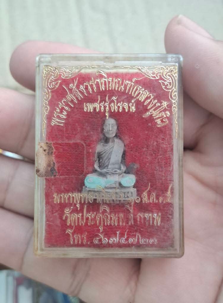 ตรงแขนขวาหลวงปู่ มีรอยชำรุดสนิมเขียวกิน มีกล่องเดิม