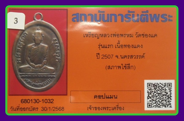 บัตรการันตี-7000-เหรียญรุ่นแรก หลวงพ่อพรหม วัดช่องแค เนื้อทองแดง พศ.2507