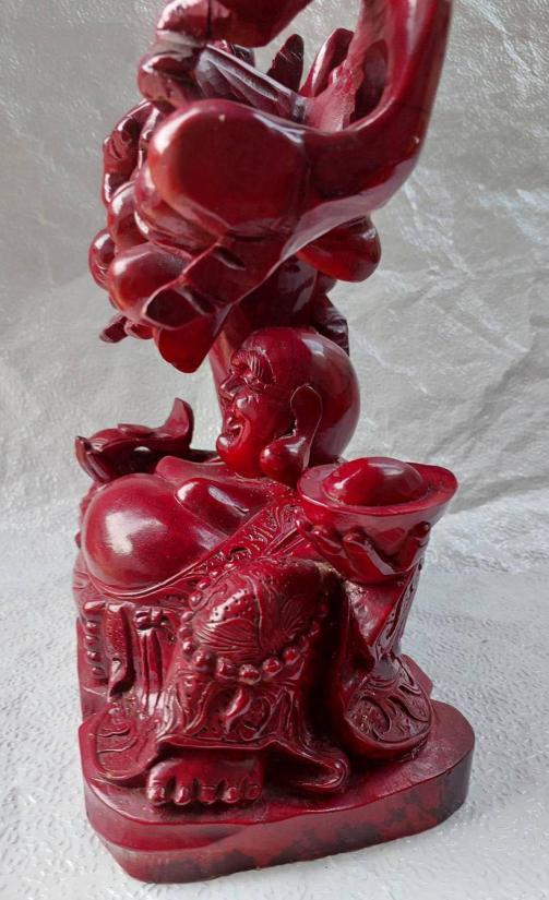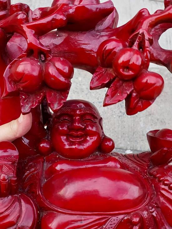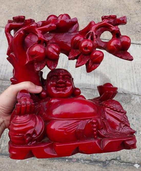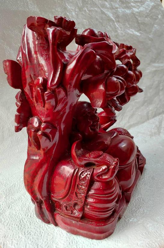พระสังกัจจายน์ที่แกะสลักจากไม้ มีลักษณะอ้วน พุงพลุ้ย ยิ้มแย้ม ใบหน้ามีความสุข ถือเป็นสัญลักษณ์แห่งความอุดมสมบูรณ์ โภคทรัพย์ และปัญญา โดยแบกถุงทองและ/หรือถือถุงเงิน แสดงถึงความร่ำรวย เงินทองไหลมาเทมา |