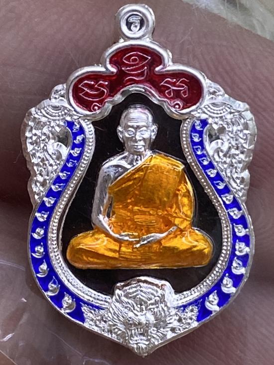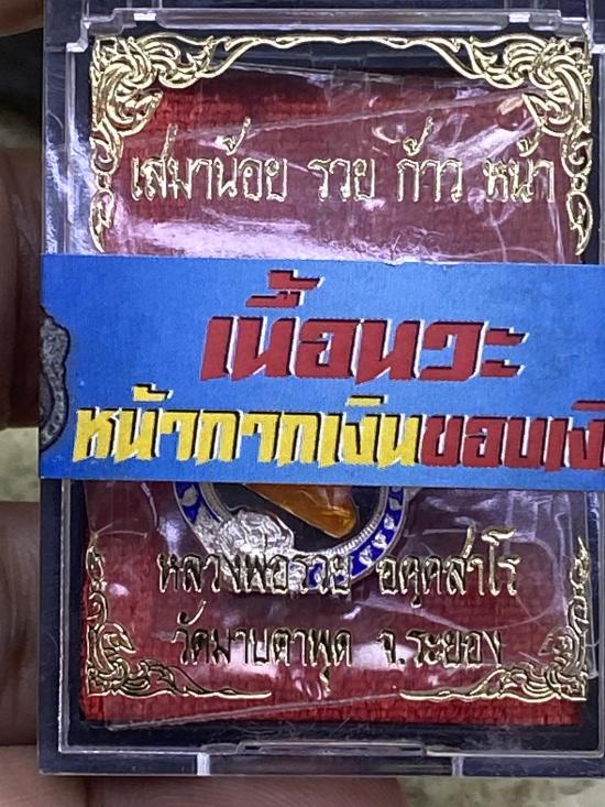 เหรียญเสมาน้อย รวยก้าวหน้า เนื้อนวะหน้ากากเงิน ขอบเงิน หลวงพ่อรวย วัดมาบตาพุด จังหวัดระยอง เลข 141 เลขสวย กล่อง จมูกสวย |