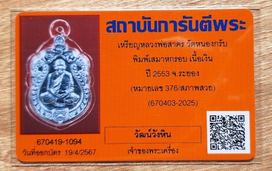 "บัตรสภาพสวย"เหรียญเสมา6รอบ หลวงพ่อสาคร วัดหนองกรับ ปี 53 เนื้อเงิน # 376 พร้อมกล่องเดิมครับ |