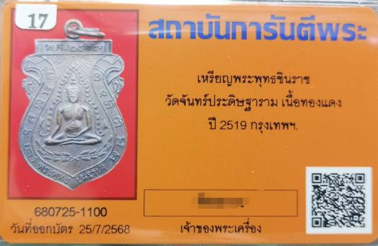 หรียญพระพุทธชินราช วัดจันทร์ประดิษฐาราม ปี2519 จ.กรุงเทพฯ |