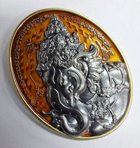 เหรียญพระพิฆเนศ รุ่น อิ่มทรัพย์ -- หลวงปู่อิ่ม วัดทุ่งนาใหม่ -- ทองทิพย์ซาตินลงยาส้ม หน้ากากนวะ หลังหน้ากากพระพรหมนวะ เลข ๓๓ -- |