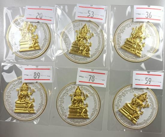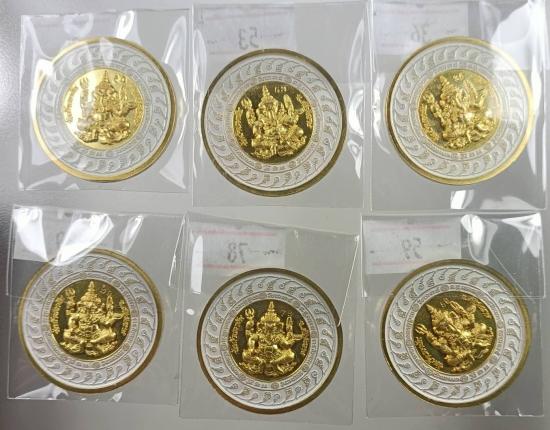 6 เหรียญ...เหรียญพระพรหม หลังพระพิฆเนศ หลวงปู่เถิง วัดบ้านอาลัย จ.ศรีษะเกษ เนื้อทองทิพย์ ลงยาขาวหน้า-หลัง หมายเลข 2 หลัก เคาะเดียว |